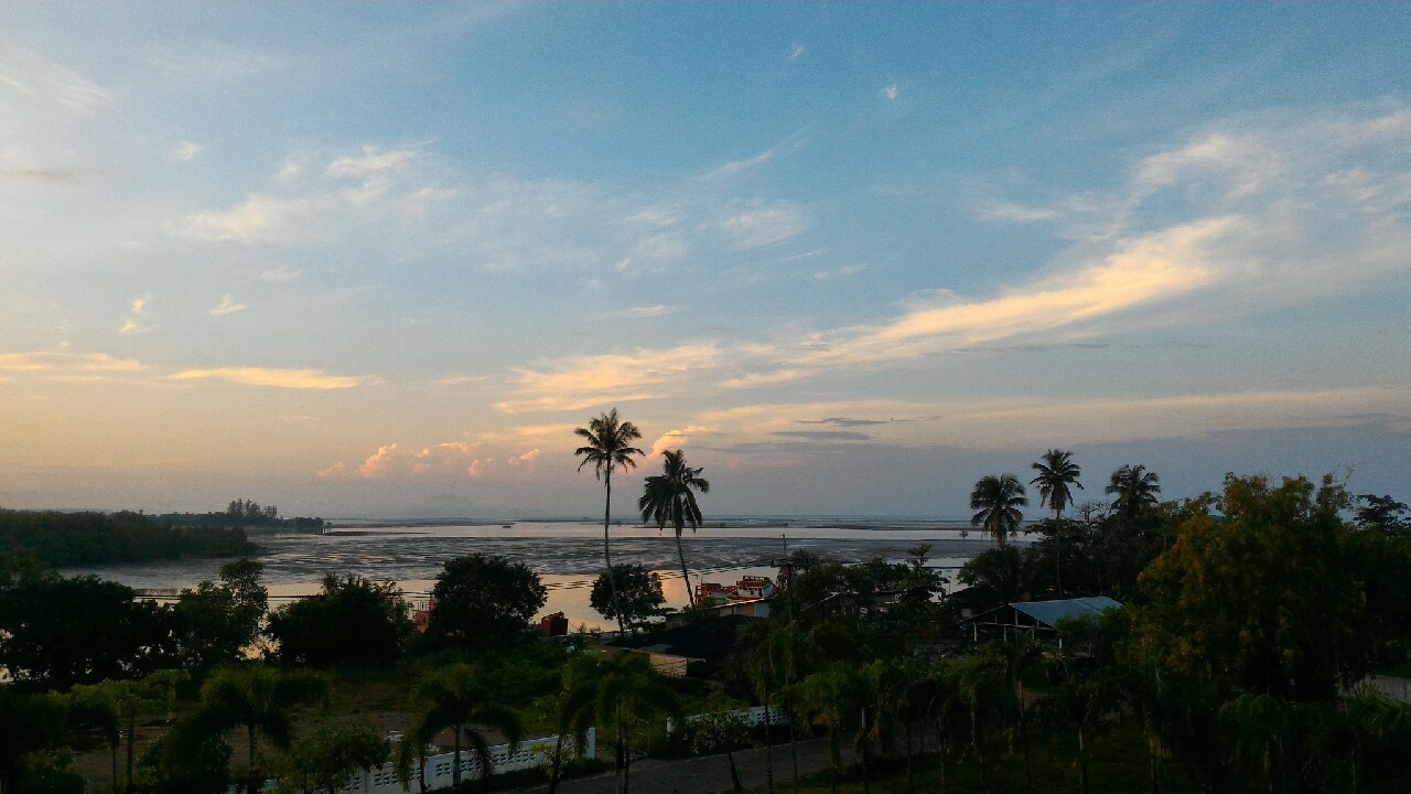 และต่อรถมอเตอร์ไซต์อีกคนละ 20 บาท ถึงโรงแรมเข้า Checkin ได้ห้องริมวิวทะเลพระอาทิตย์ตก มองเห็นสระว่ายน้ำ รู้สึกชอบเพราะเงียบดี ก็พักกันนิดหน่อย และเย็นๆ ก็ออกไปหาอะไรกินที่ตลาด และ โต้รุ่งเลียบแม่น้ำ สวนสาธารณะของเมืองกระบี่ และชมความงามของเขาขนาบน้ำ